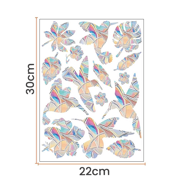Os adesivos direcionam os reflexos solares refletidos através do vidro para alertar os pássaros e impedir que machuquem-se batendo nas portas e janelas de vidro.